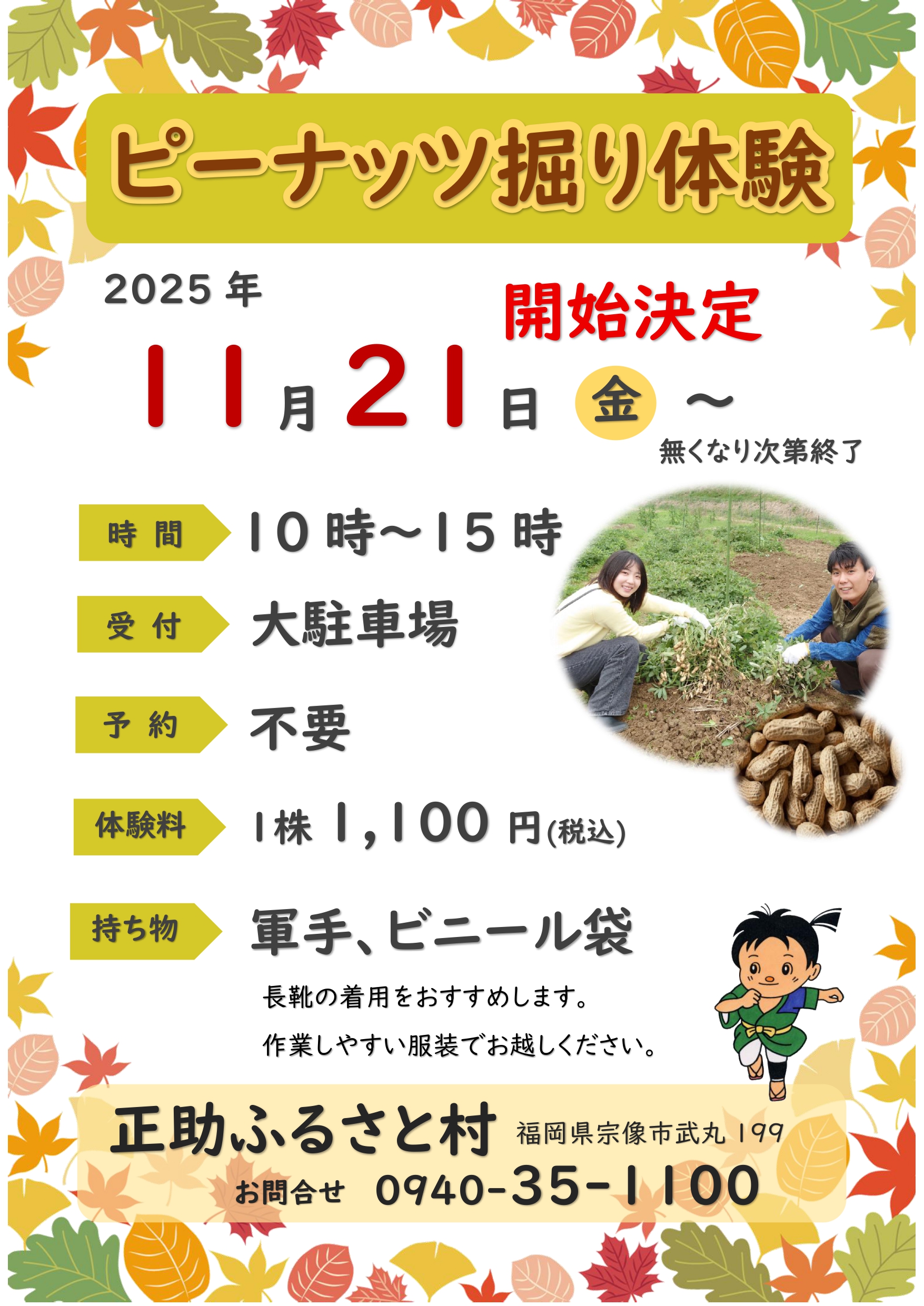 2025年11月16日 / 最終更新日時 : 2025年11月16日 syosuke お知らせ ピーナッツ掘り体験 開始日決定 正助ふるさと村で開催されるピーナッツ掘り体験は11月21日(金)~開始決定です。無くなり次第終了となります。 皆さまのお越しをお待ちしております。 予約不要:現地に来られてからの順次ご案内となります。 FacebookXBlueskyHatenaCopy
