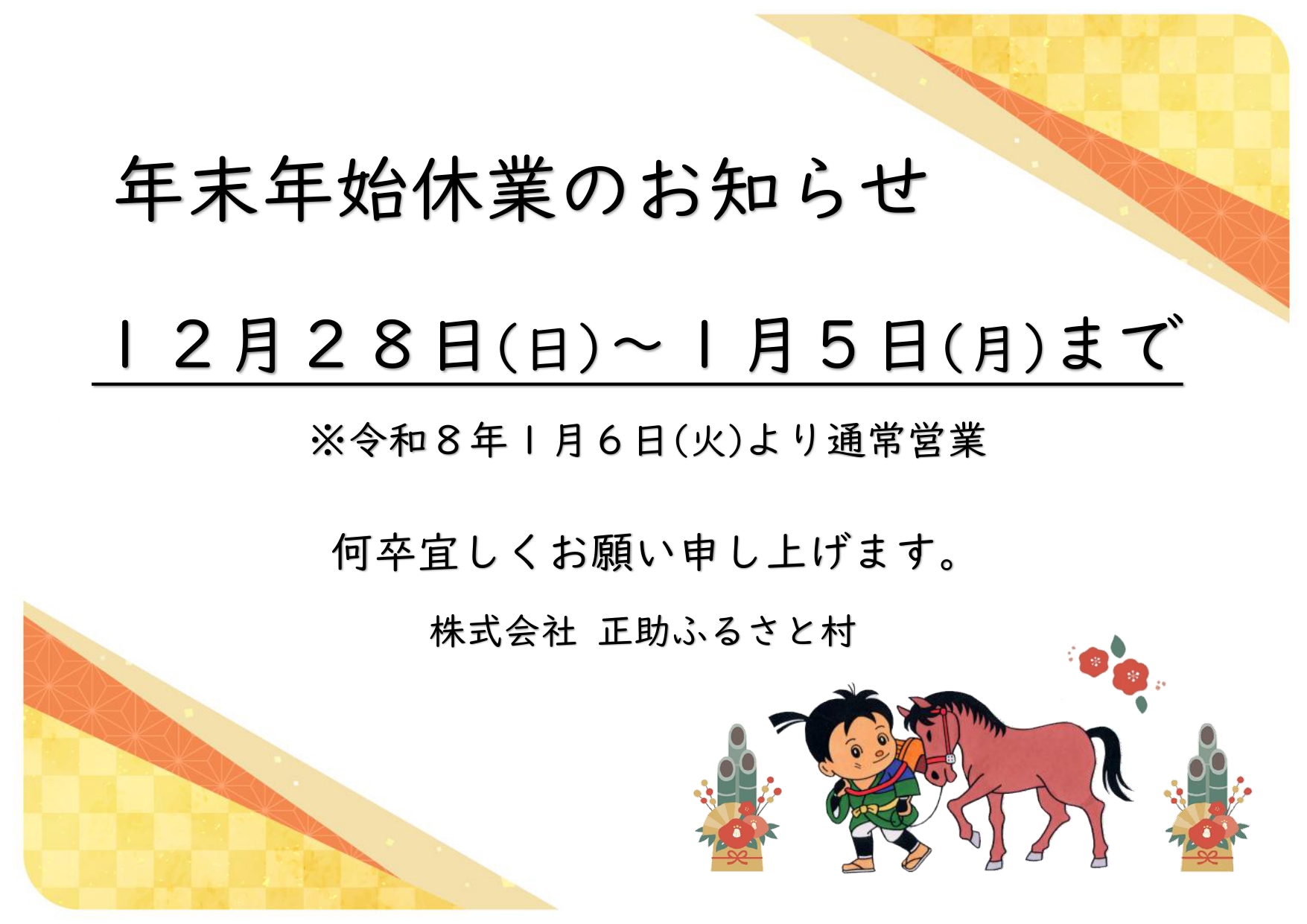 2025年12月20日 / 最終更新日時 : 2025年12月20日 syosuke お知らせ 年末年始休業のお知らせ 【年末年始休業のお知らせ】 12月28日(日)~1月5日(月)までお休み※令和8年1月6日(火)から通常営業 お客様にはご迷惑をお掛けしますが、何卒宜しくお願い申し上げます。 FacebookXBlueskyHatenaCopy